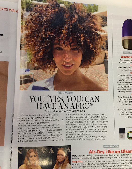 If it'due south non a white model photographed in blackface, information technology'southward an commodity declaring baby-hair and cornrows equally the latest "trends" -- even though those black styles have been around forever. This week, Allure magazine drew criticism for posting a brief article education "straight haired girls" (ie: white girls) how to get an afro.